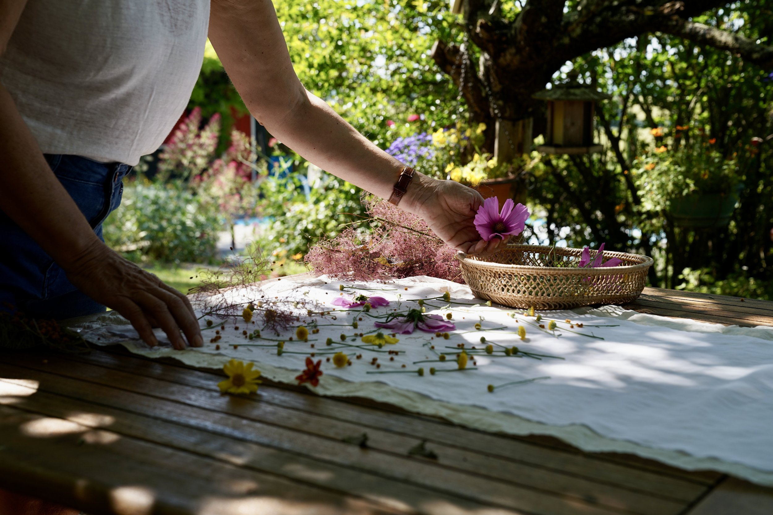 Le jardin de la Cernailla fournit une infinité d’espèces botaniques à imprimer. C’est un paradis de couleurs qui produit toute l’année des plantes tinctoriales. Je les utilise aux quatre saisons, pour mes propres créations textiles ou lors des stages d’initiation que je propose régulièrement.